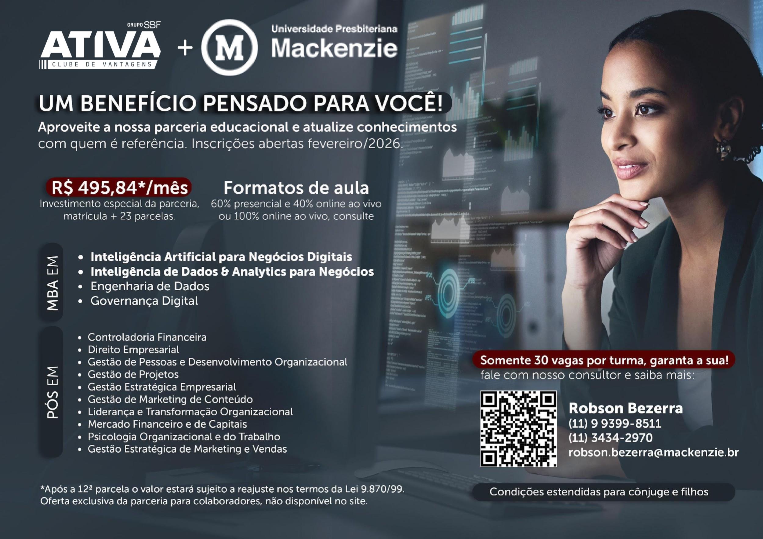 Aproveite a parceria educacional exclusiva da Ativa com a Mackezie e atualize seus conhecimentos com uma das universidades mais reconhecidas do país.