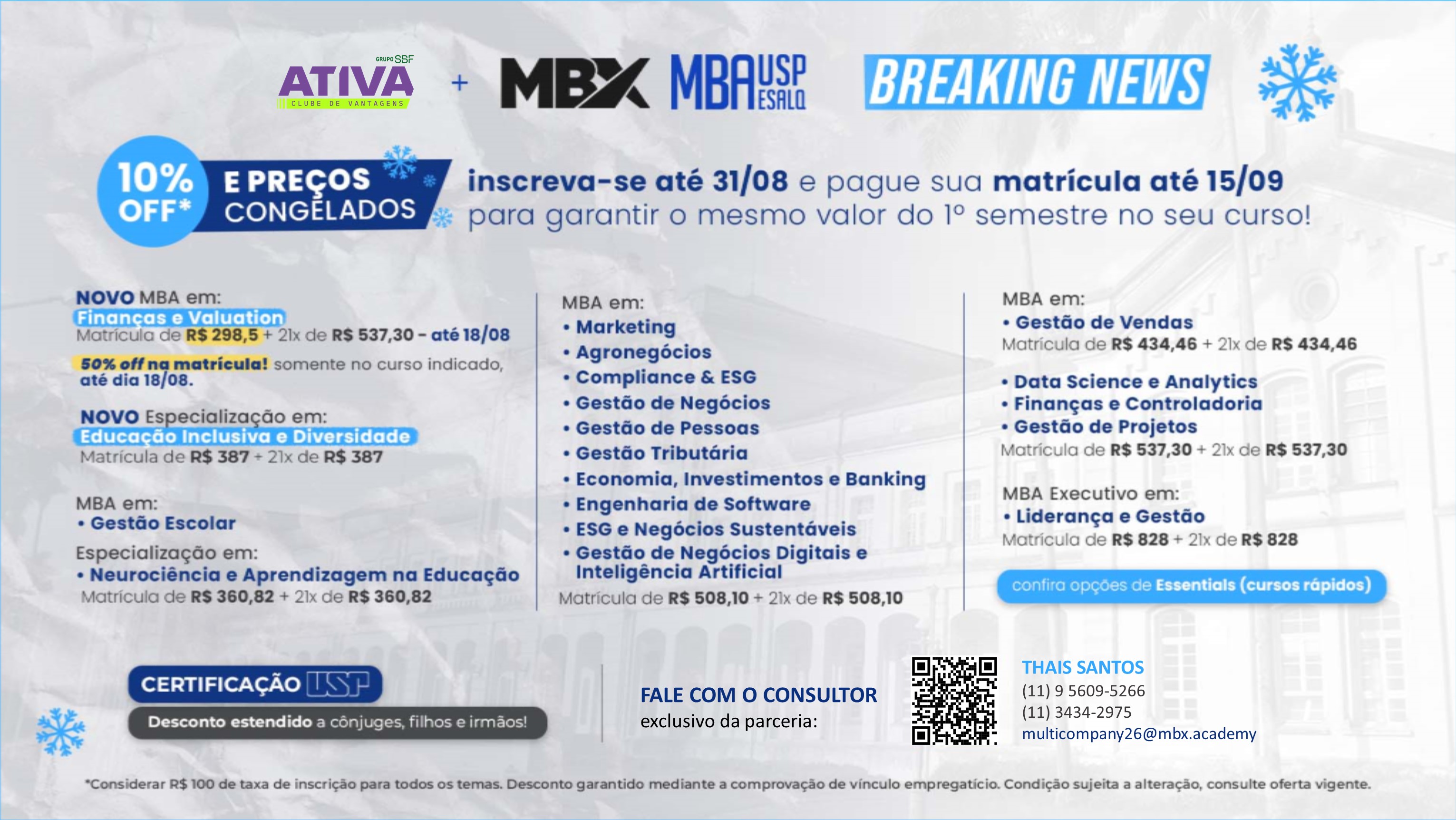A USP/ESALQ congelou os preços dos cursos de MBA do 1° semestre para que você faça a sua matrícula até o dia 31 de agosto e pague apenas em 15 de setembro. Os descontos também valem para os dependentes.