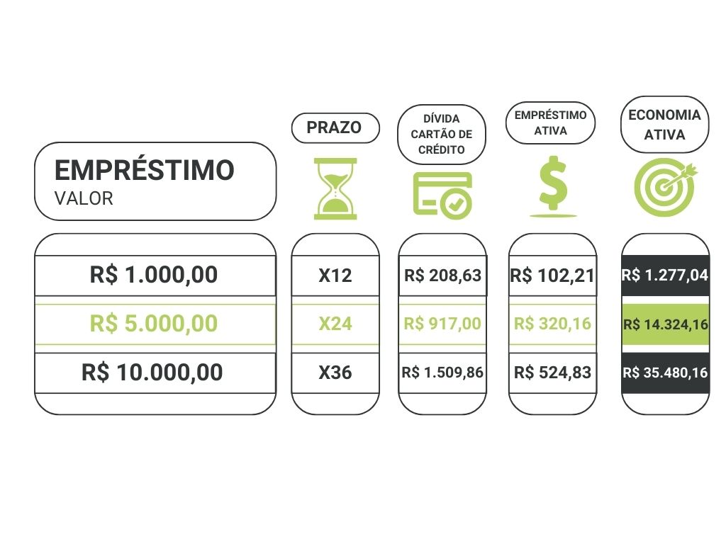 Além dos prêmios, nossas taxas são super vantajosas. Por exemplo, se você tem dívida no cartão de crédito, simule trocar essa dívida com a Ativa, veja abaixo: