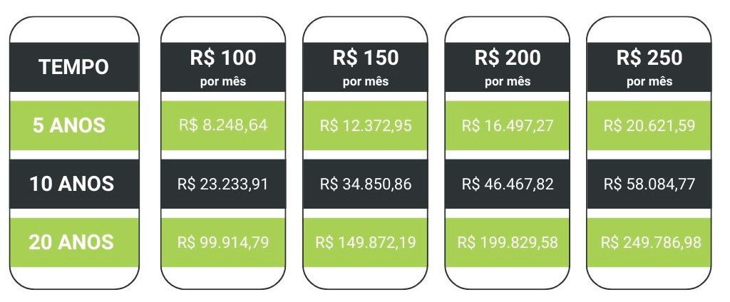 Na imagem abaixo você pode conferir como o investimento mensal de um pequeno valor pode fazer muita diferença no longo prazo: